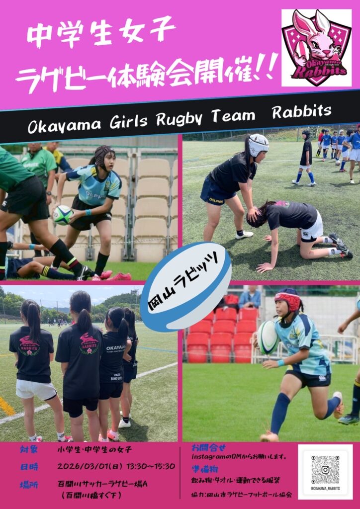 岡山県内唯一の女子中学生ラグビーチーム、岡山ラビッツが体験会を行います。小学生から参加可能です。
